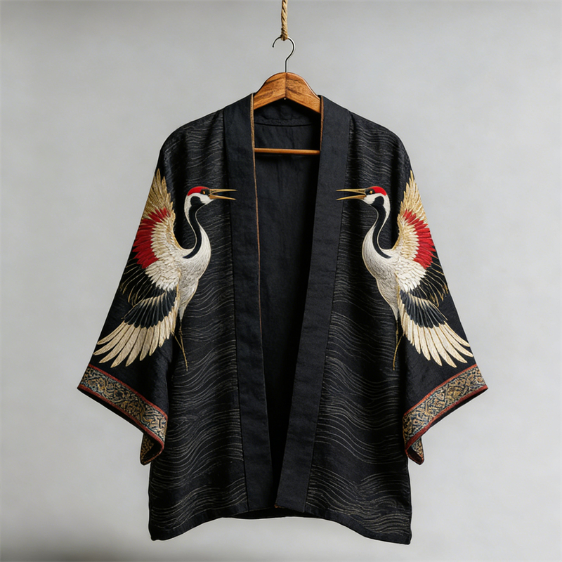 Japanese Cranes Black Sea Waves Art Linen Kimono