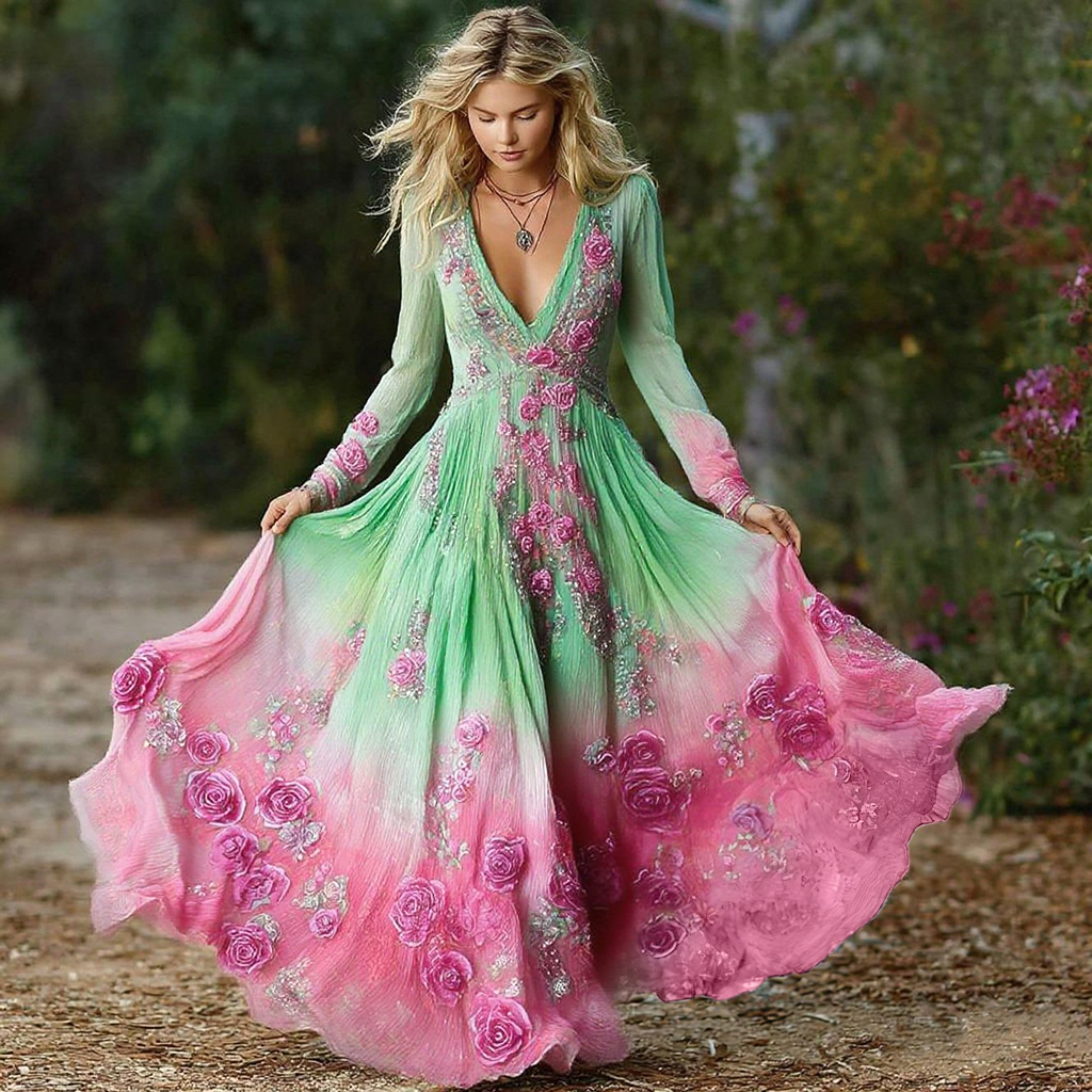 Women's Retro Rose Floral Gradient Pattern V-neck Short Sleeve Dress