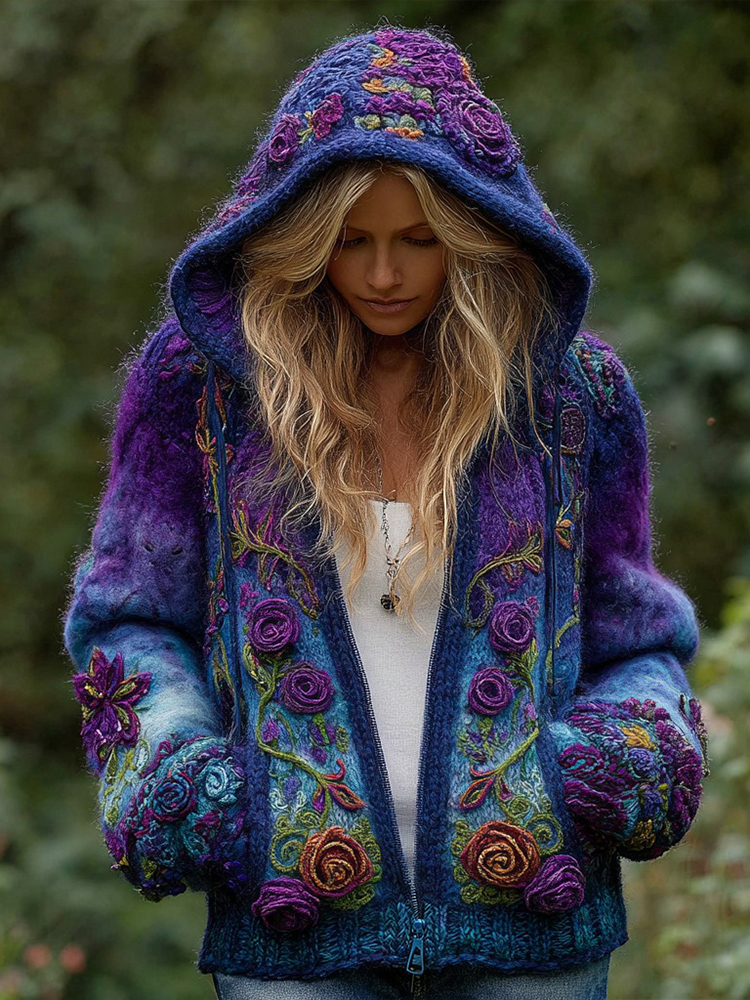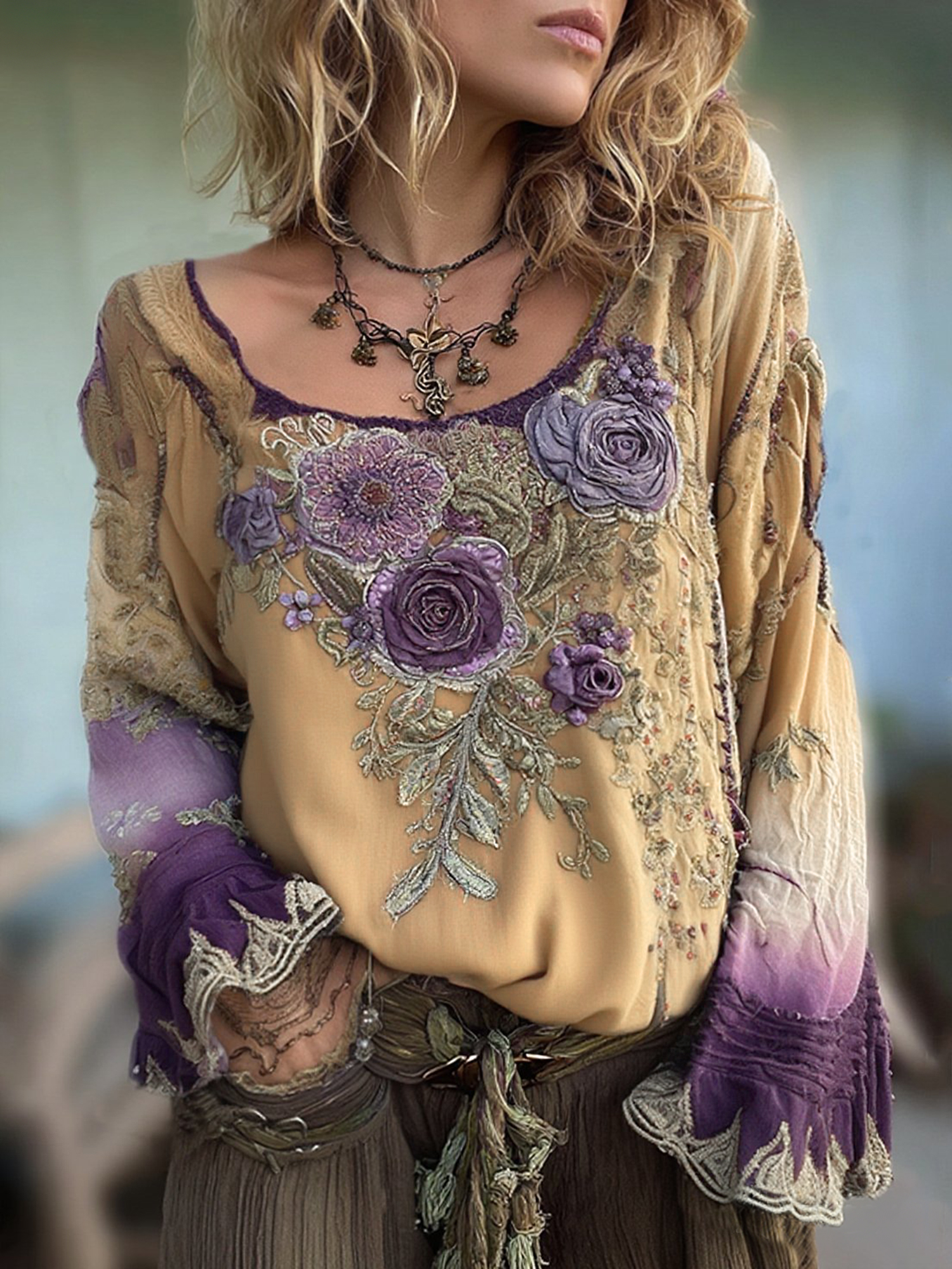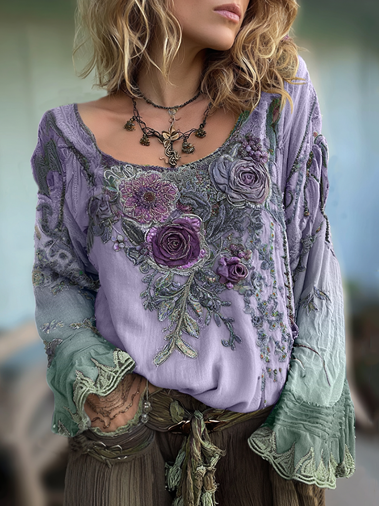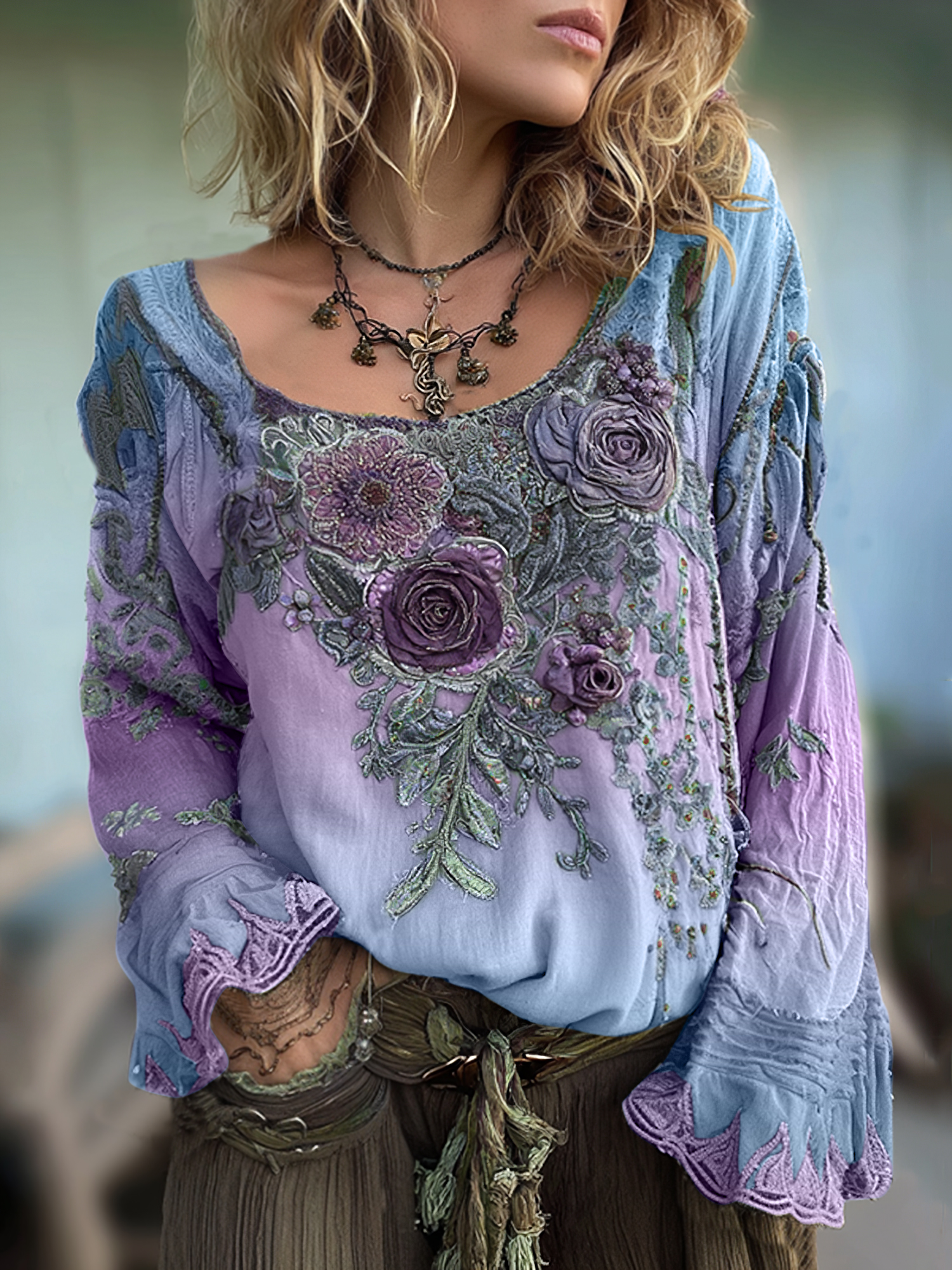 Vintage Classy Gradient Purple Pansy Embroidered Art Linen Long Sleeve Blouse