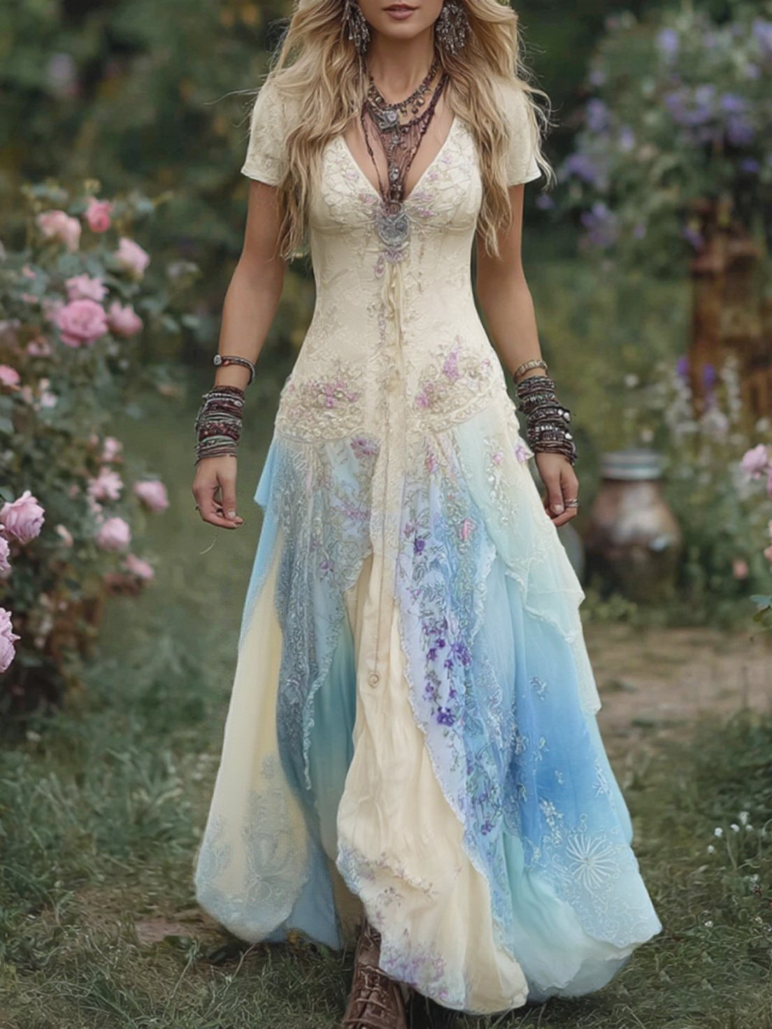 Women's Vintage Floral Embroidery Gradient Pattern Round Neck Dress