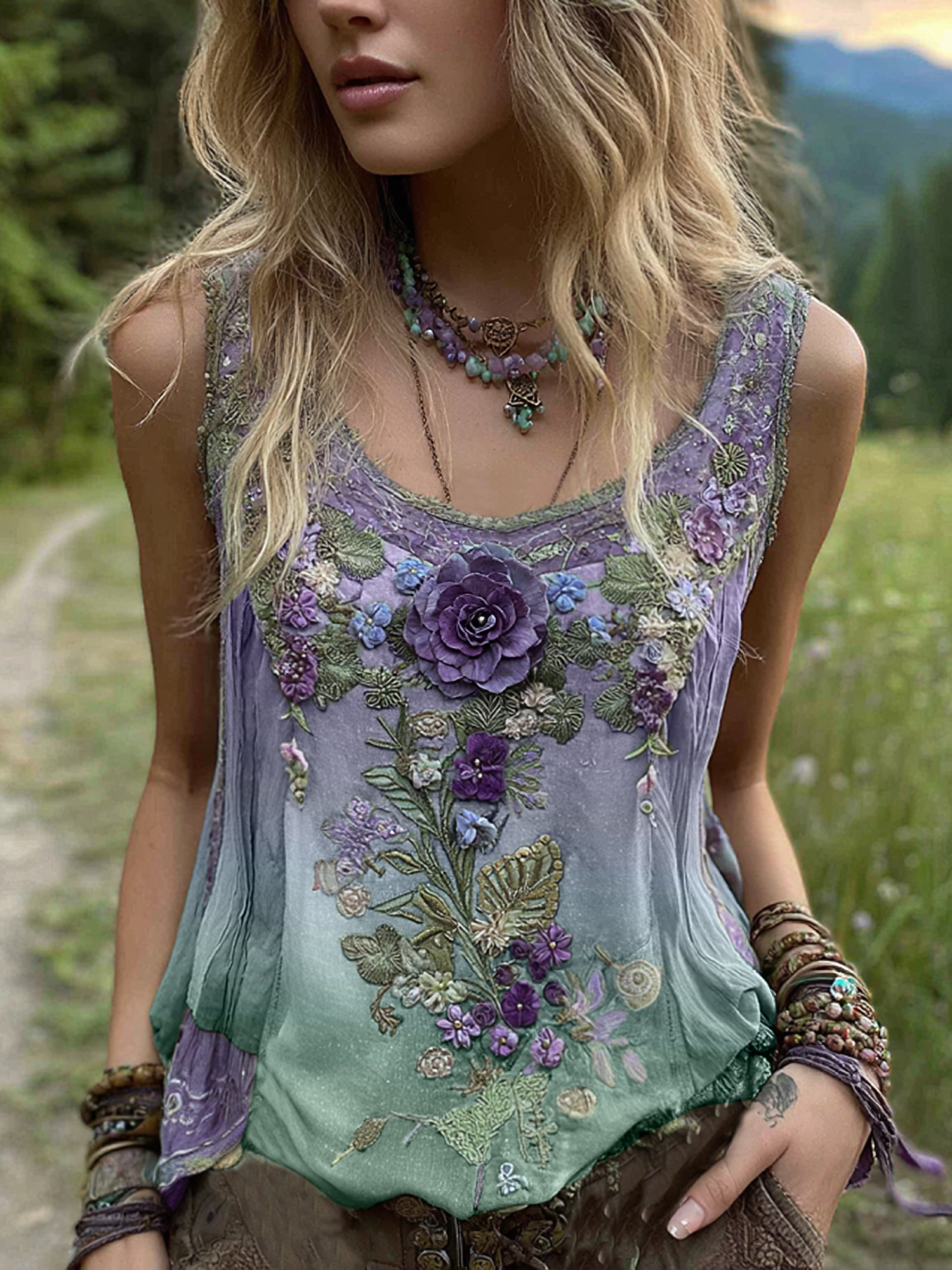Vintage Classy Gradient Purple Lavender And Floral Embroidered Pattern Linen Tank Top