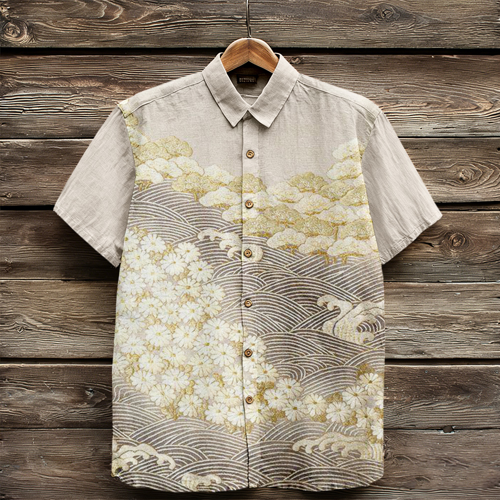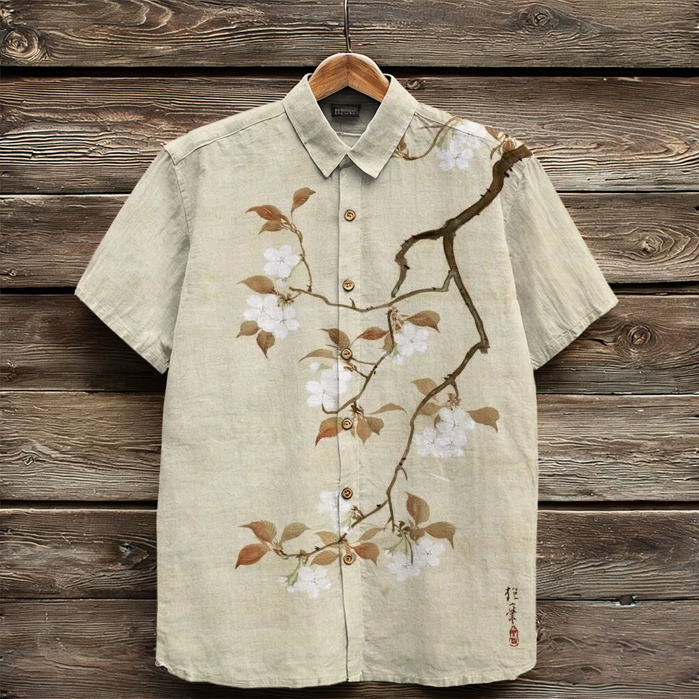 Men's Japanese-style Pine Tree And Cherry Blossom Pattern Linen Blend Shirt