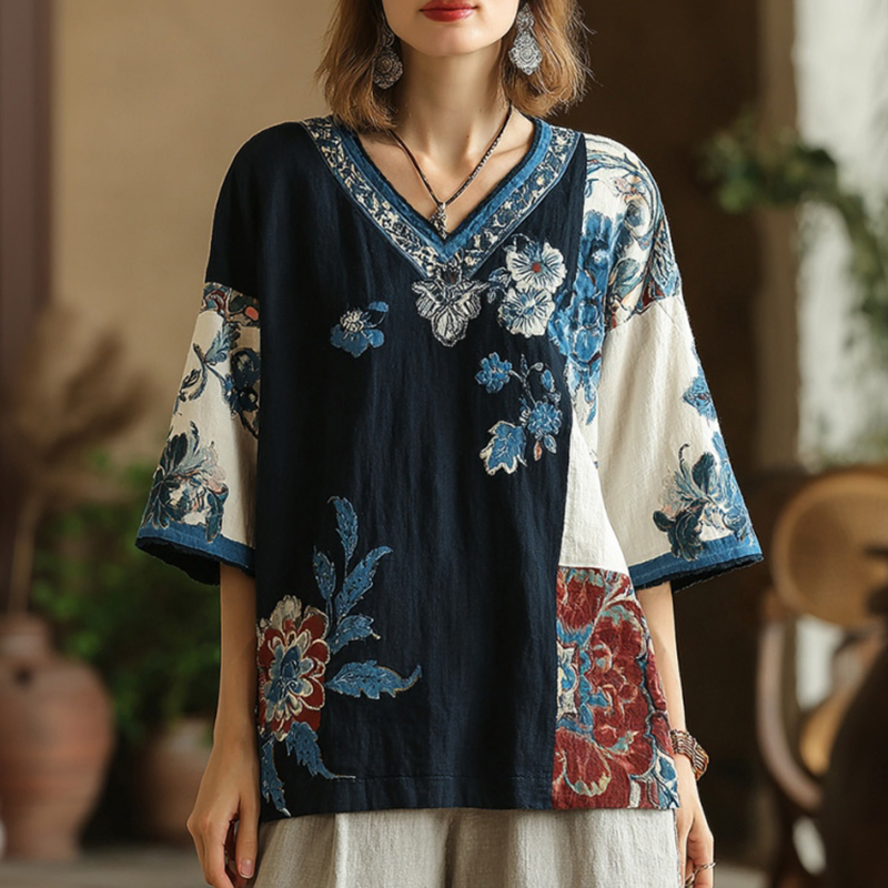 Women's Floral Pattern Color Block Linen V-neck T-shirt