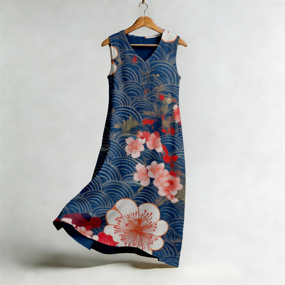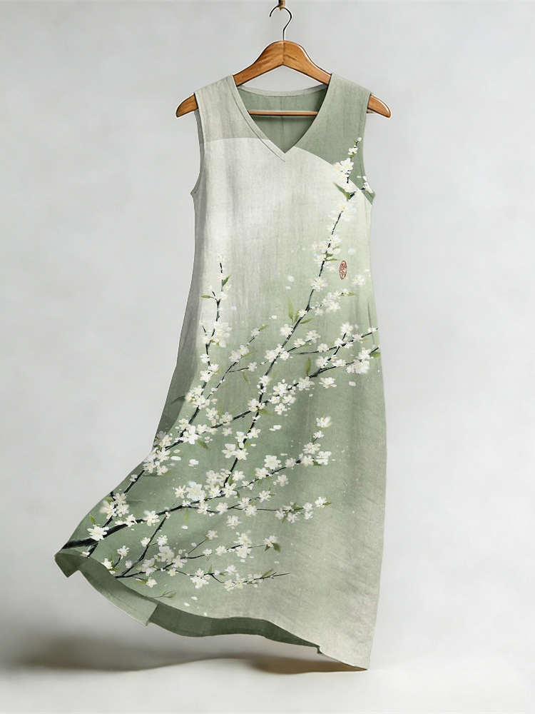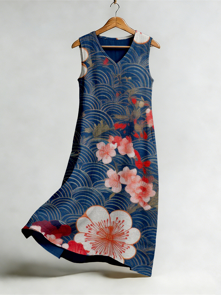 Japanese Floral Art V Neck Flowy Linen Midi Dress