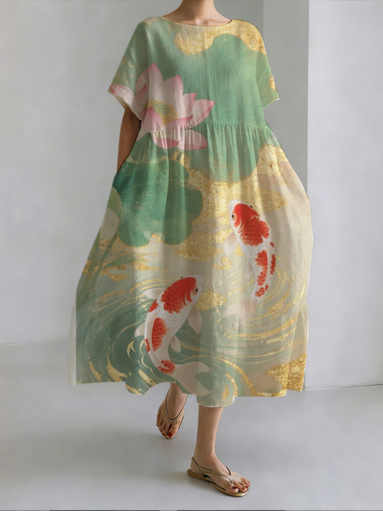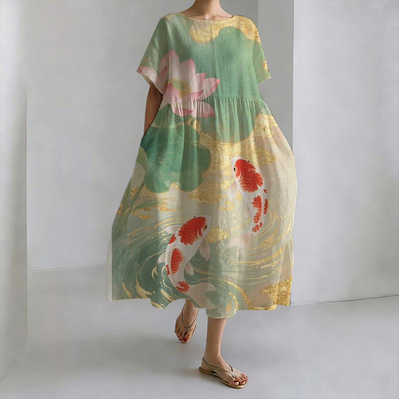 Japanese Style Koi And Lotus Pond Round Neck Casual Dress