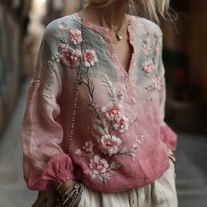 Women's Vintage Pink Floral Gradient Pattern Linen V-neck T-shirt