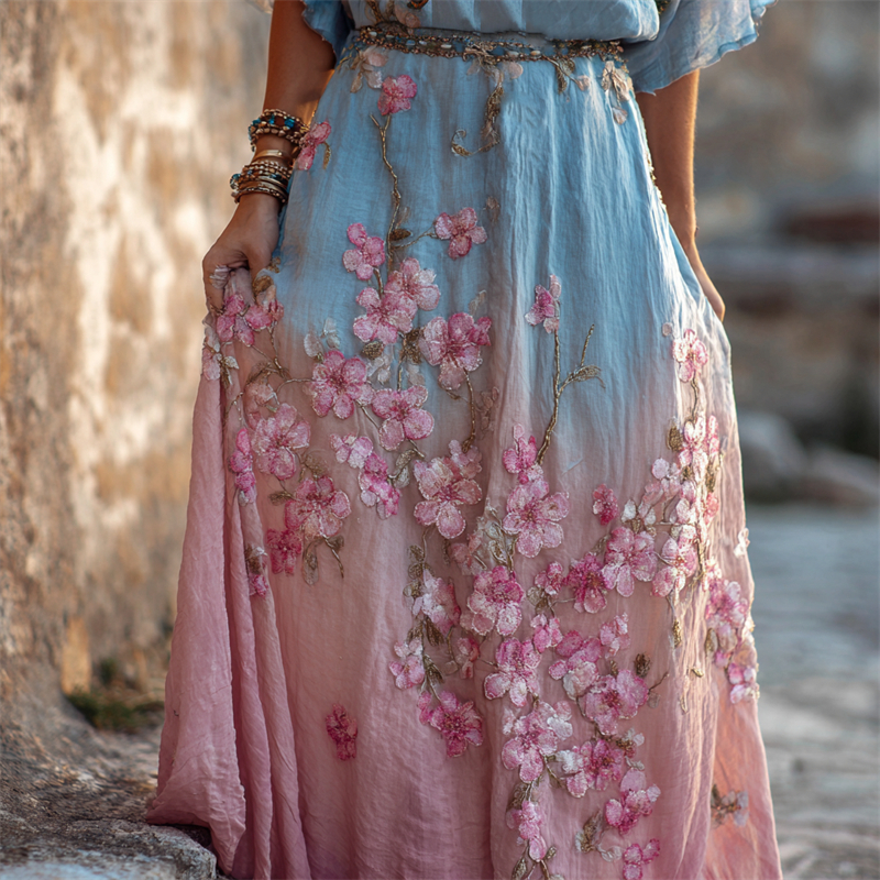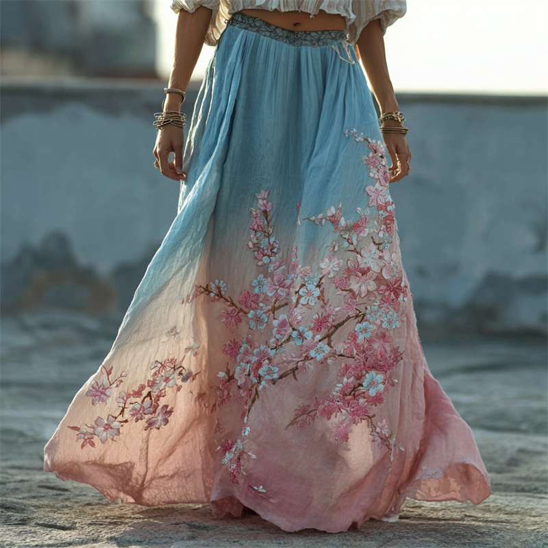 Boho Japanese Cherry Blossom Gradient Flowy Wide Skirt