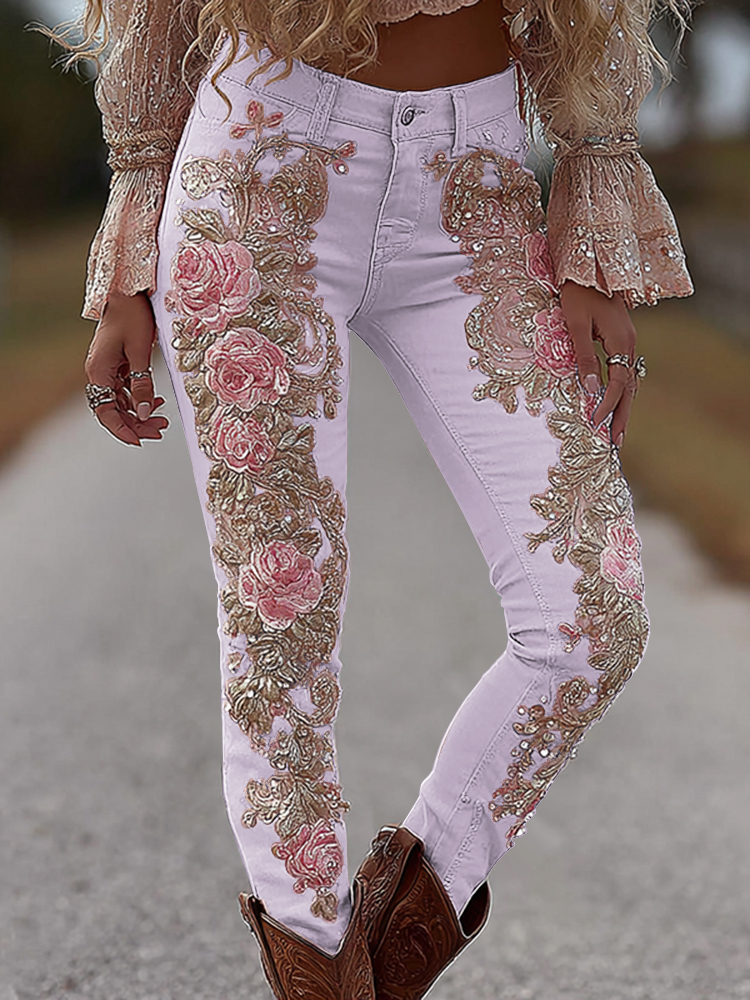 Love & Health Collection Retro Rose And Floral Patchwork Art Linen Pants