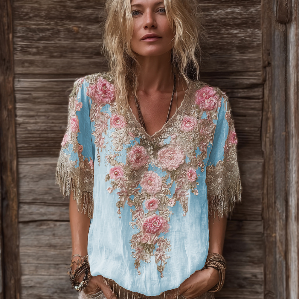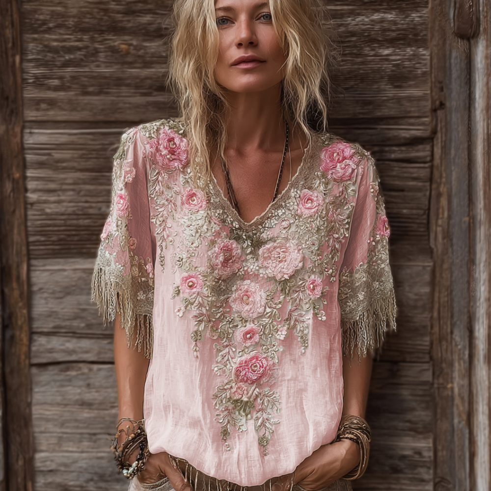 Classic Bohemian Style Pink Rose Vintage V-neck Hoodie