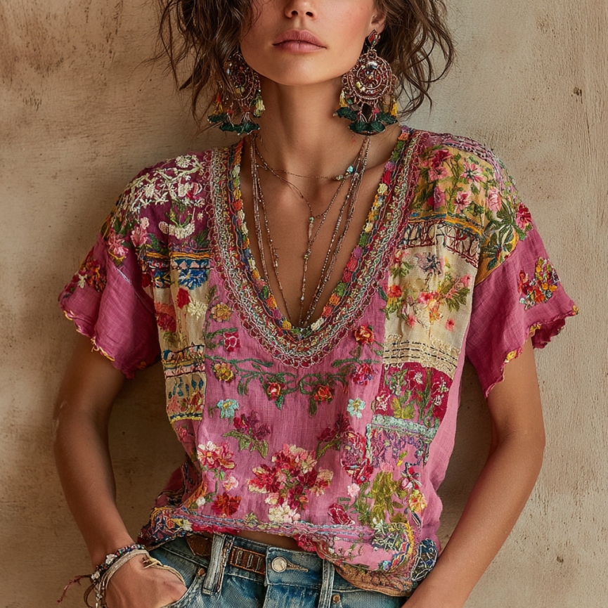 Women's Vintage Floral Embroidery Casual Crew Neck Shirt