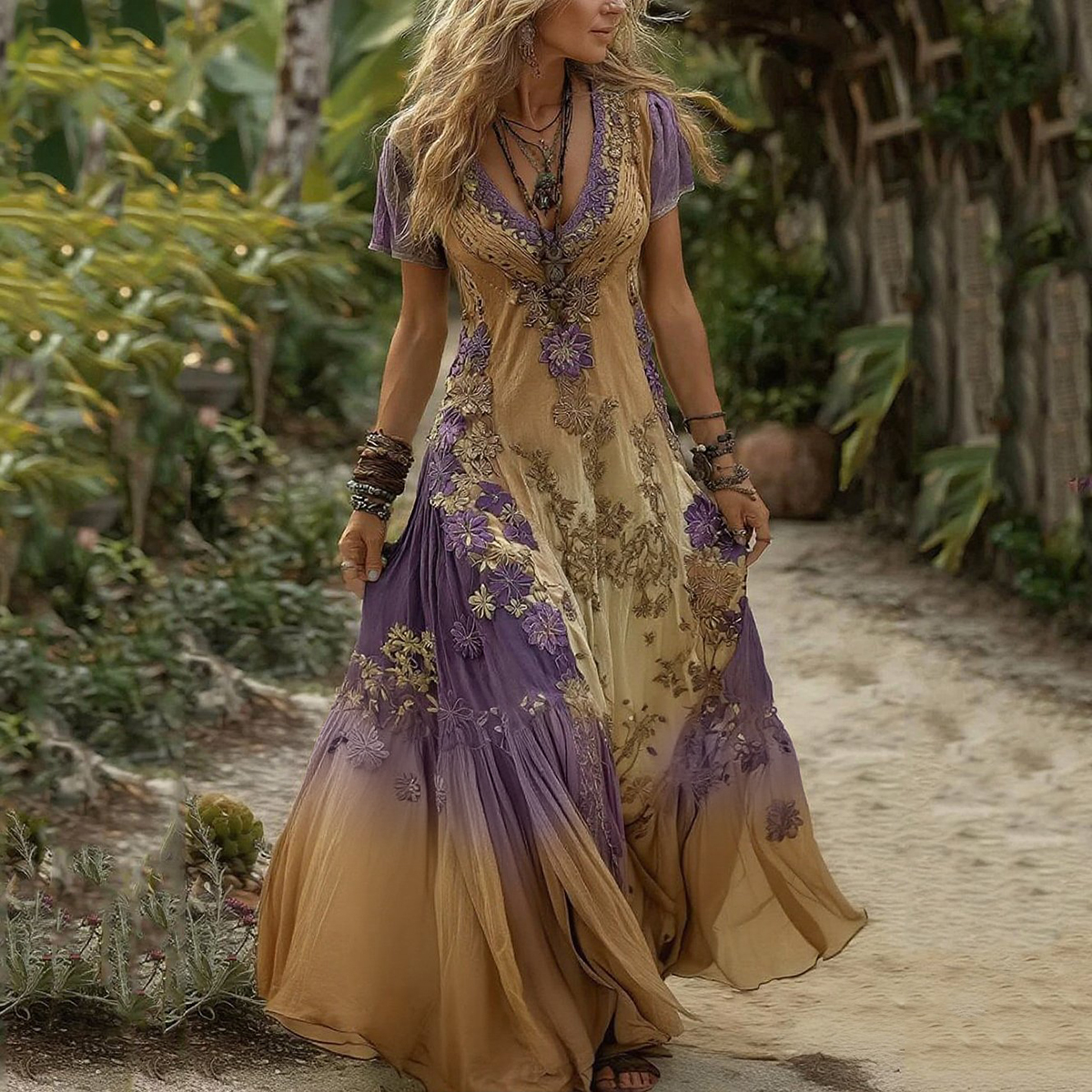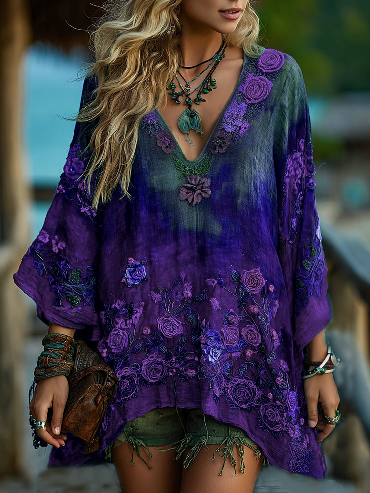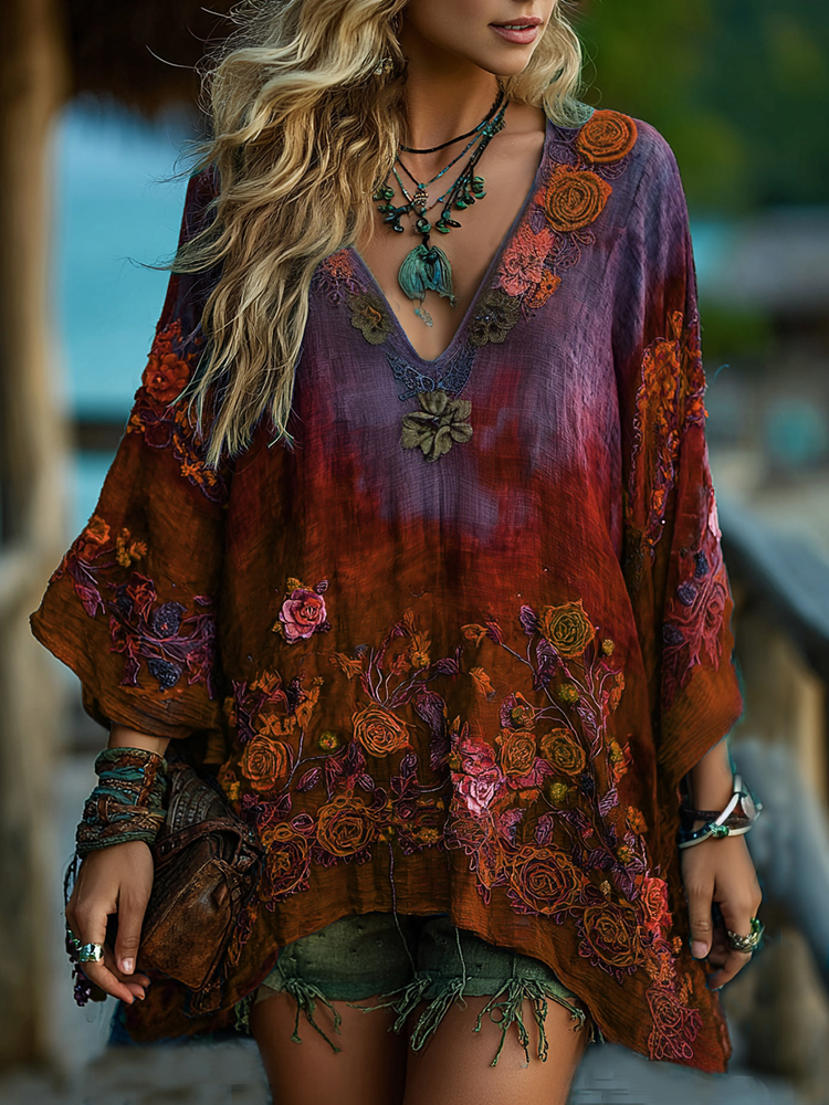 Women's Vintage Floral Embroidery Gradient Pattern V-neck Dress
