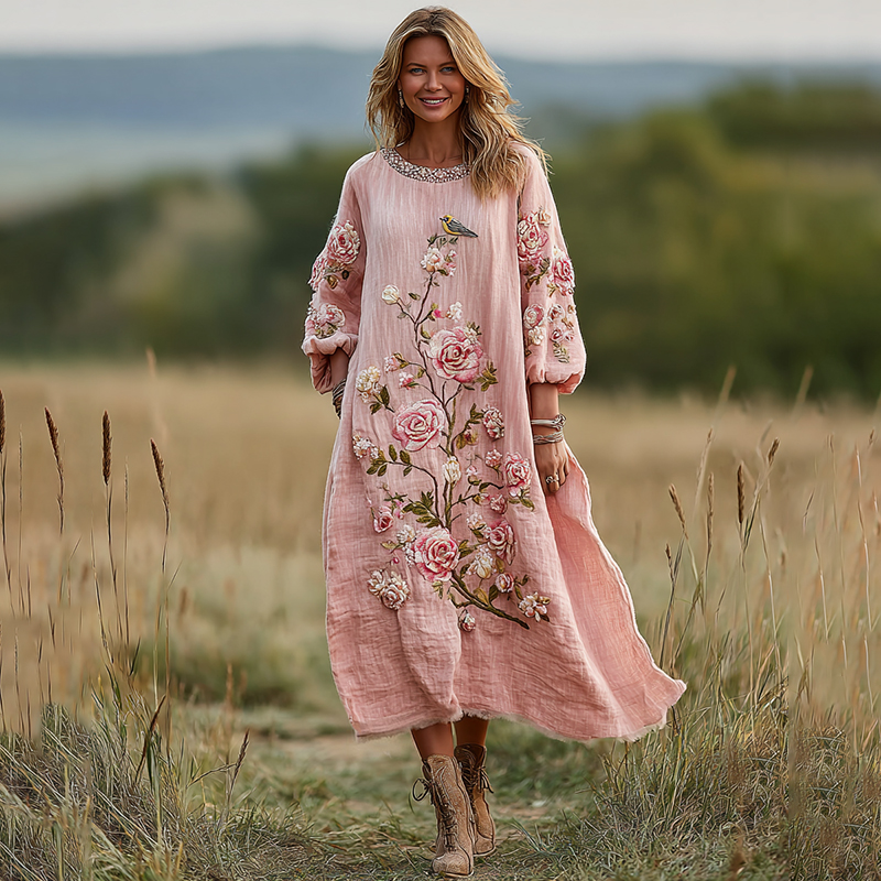 Elegant Boho Pink Roses Embroidered Flowy Lace Linen Maxi Dress
