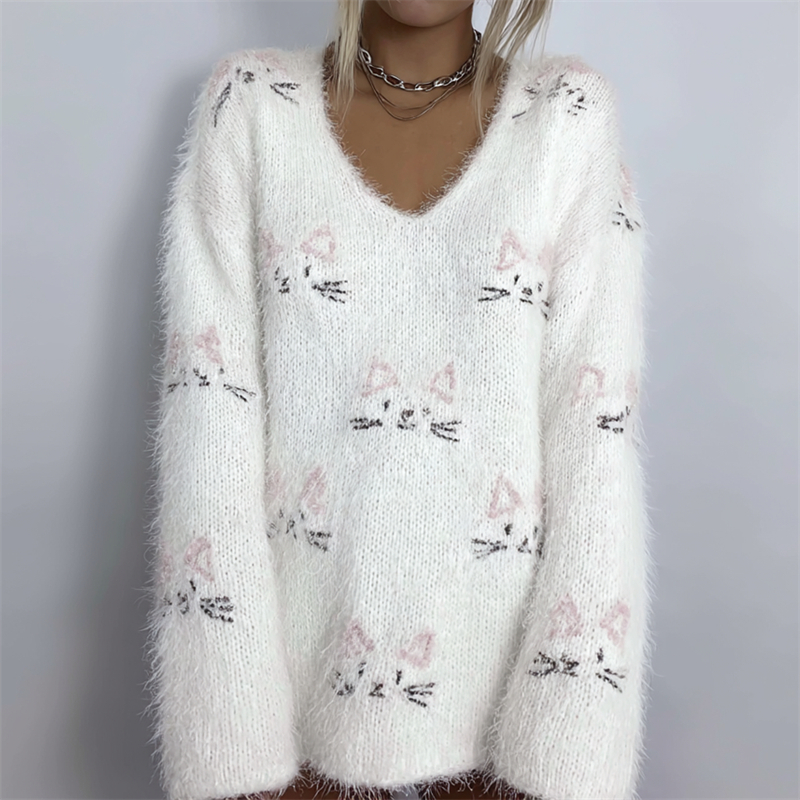 Lovely Cat Faces Embroidered V Neck Fuzzy Sweater