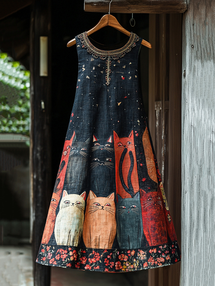 Casual Pop Art Patchwork Cotton Linen Cat Dress