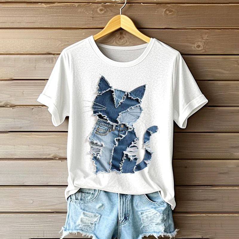 Women's Cute Cat Denim Patchwork Art T-shirt