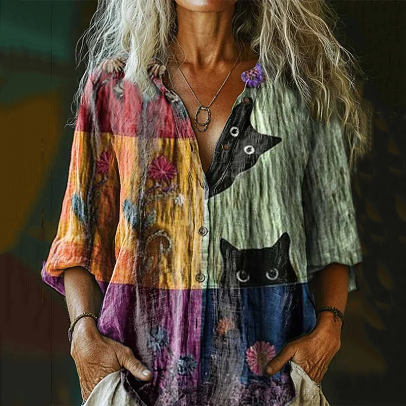 Women's Floral Cat Pattern Art Casual Linen Henley Collar Shirt