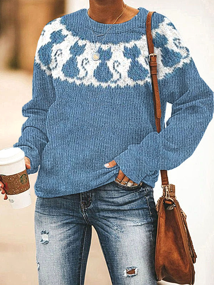 Women's Christmas Cat Print Crew Neck Casual Sweatshirt