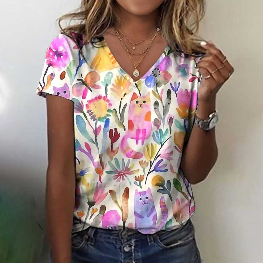Women's Cute Cat Patchwork V-neck T-shirt