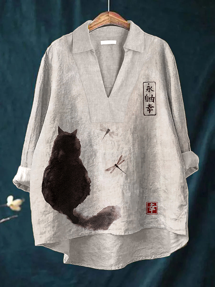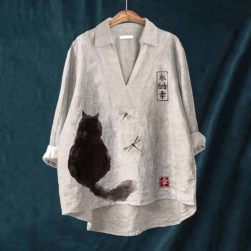 Women's Vintage Cat Art Print Cotton And Linen Shirt