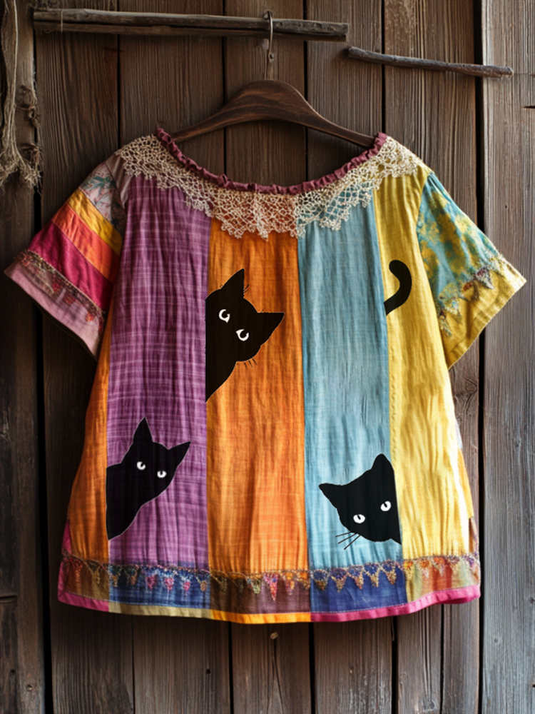 Vintage Abstract Creative Black Cat Peeking With Floral Patchwork Art Cotton Linen Comfy Shirt
