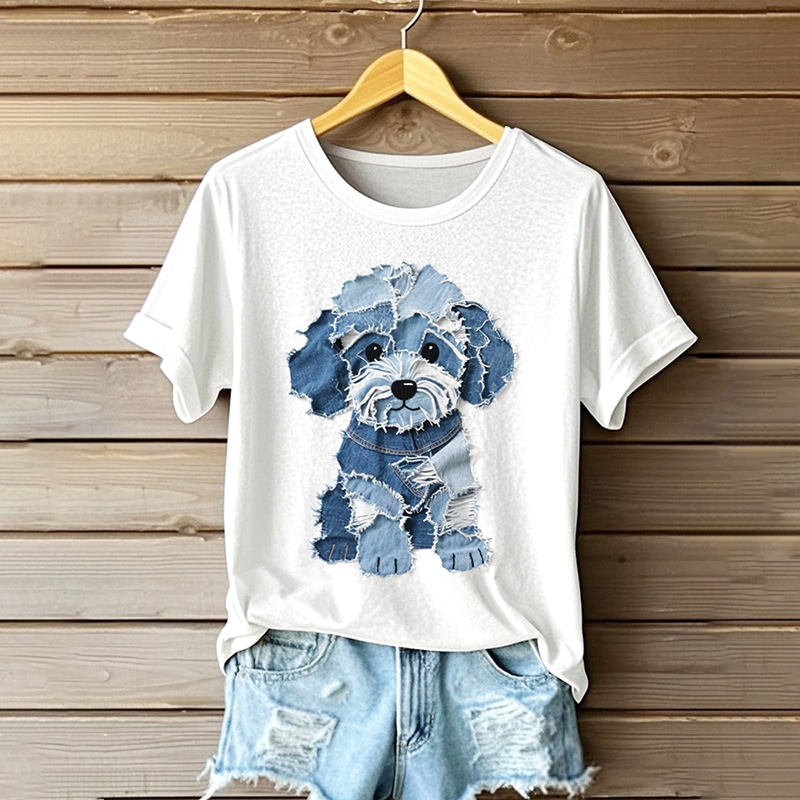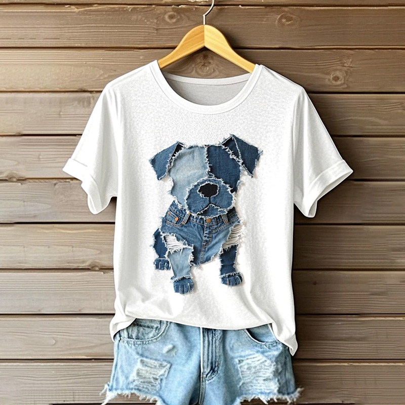 Women's Cute Dog Denim Patchwork Art T-shirt