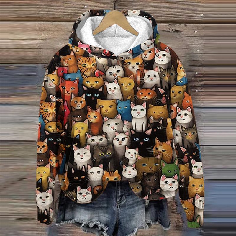 Cat Print Long Sleeve Casual Hoodie