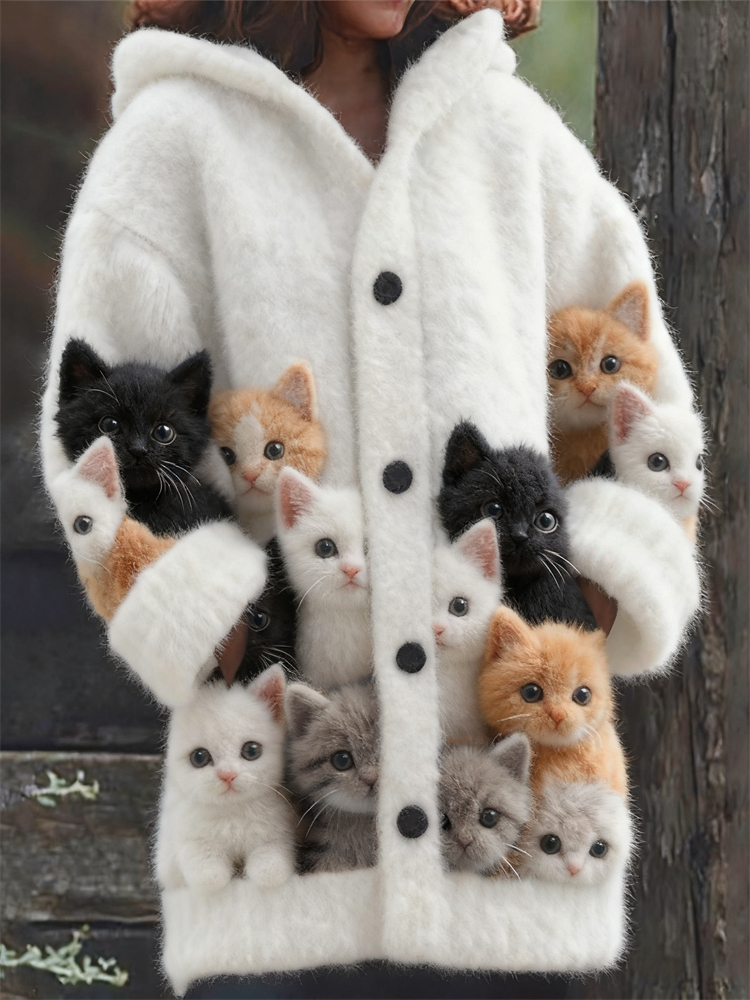 Lovely Fuzzy Cats Cozy Knit Hooded Cardigan