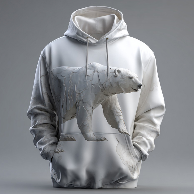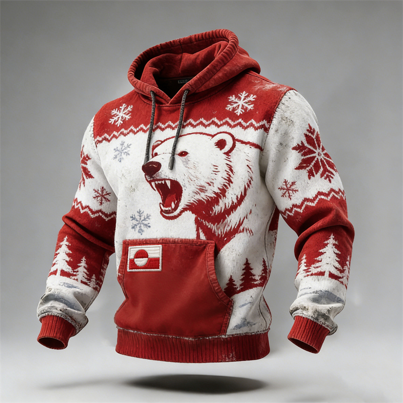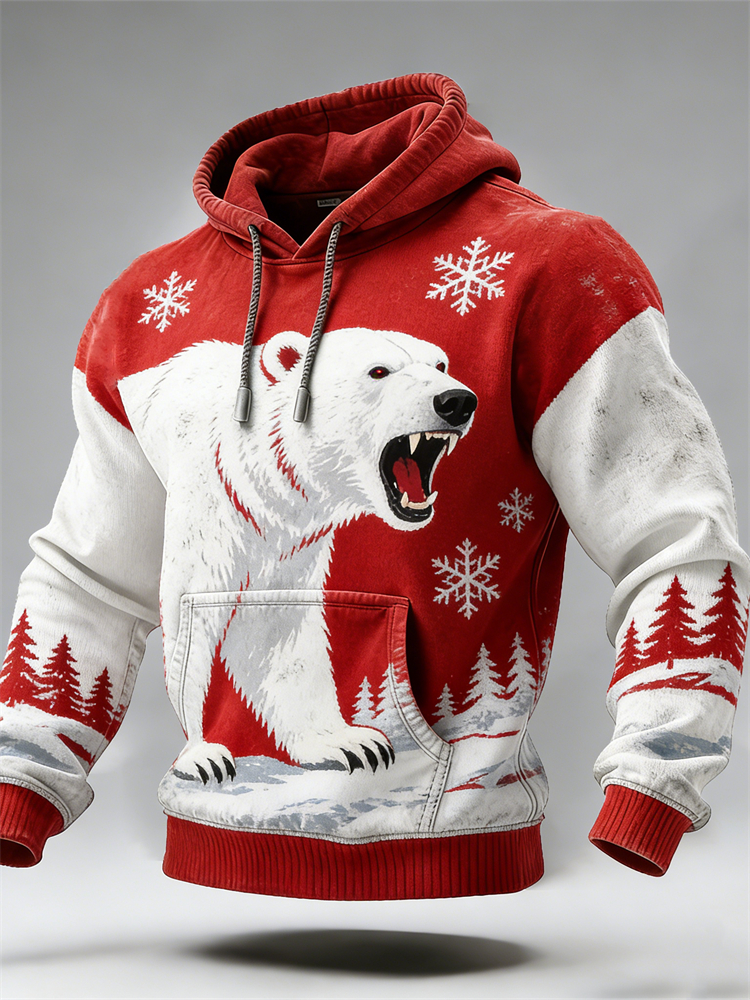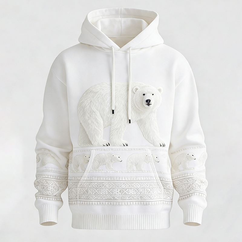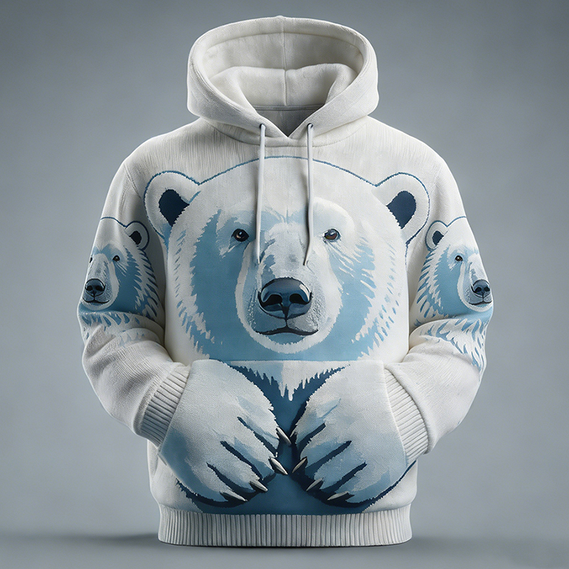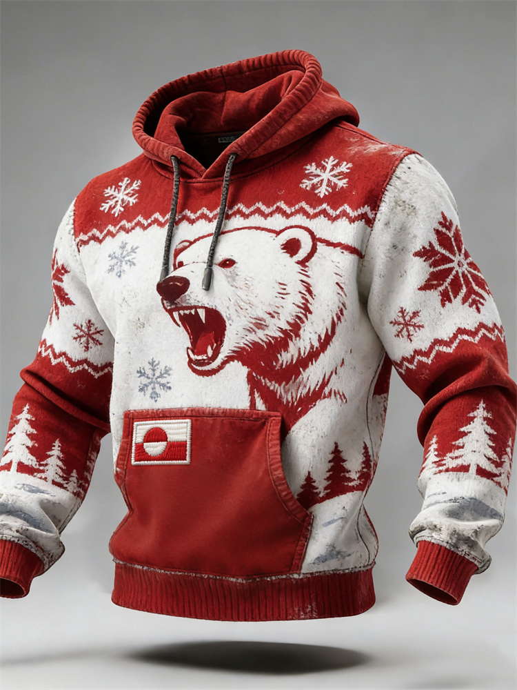 Men's Vintage Polar Bear Pattern Plush Warm Hooded Sweatshirt