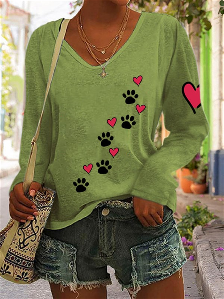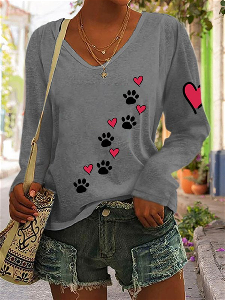 Puppy Footprint Heart Print Long Sleeve T Shirt