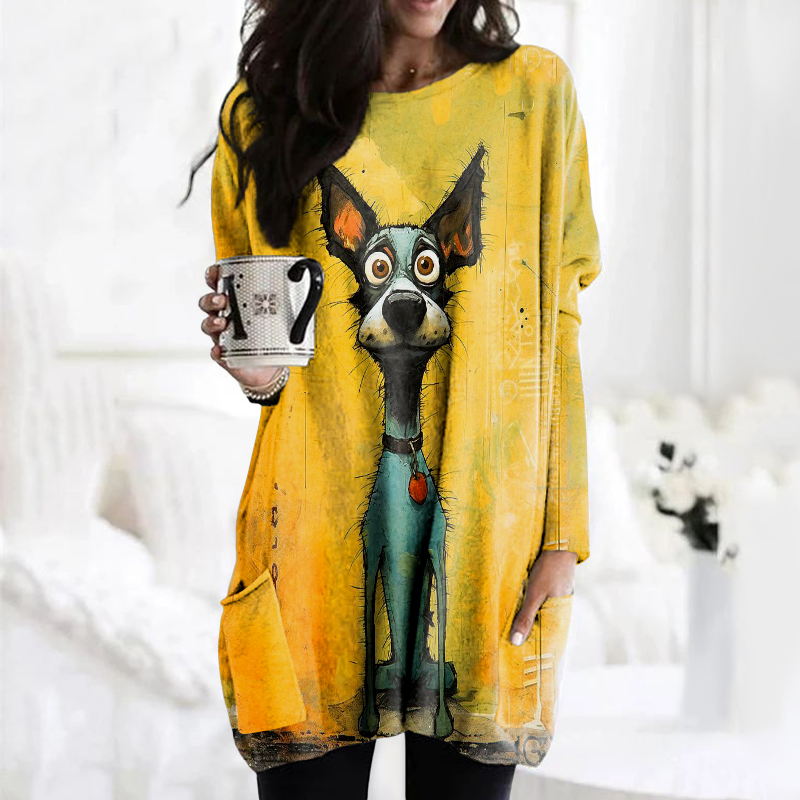 Art Dog Print Crew Neck Long Sleeve Pocket Tunic