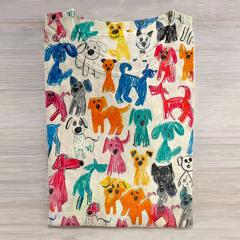 Cute Kid Drawing Dog Art Print Casual Short Sleeve T-Shirt