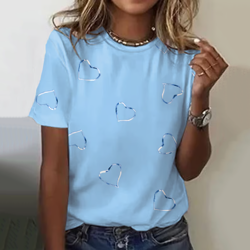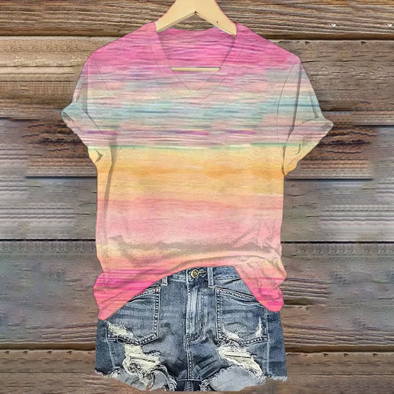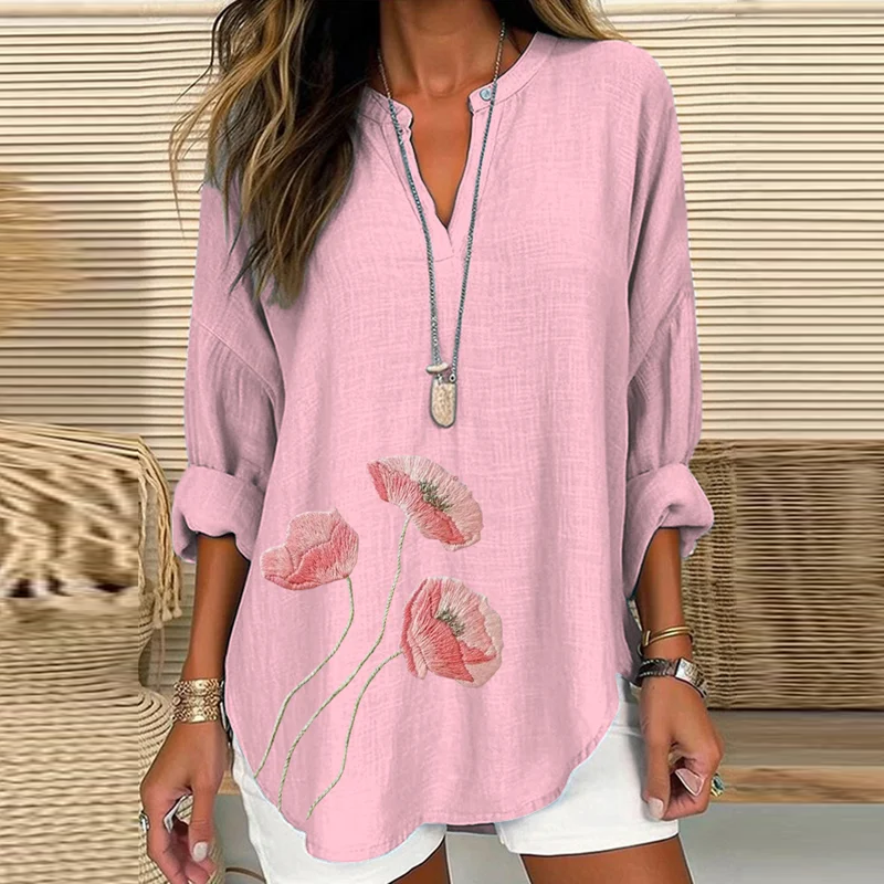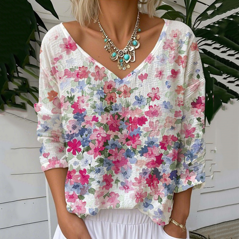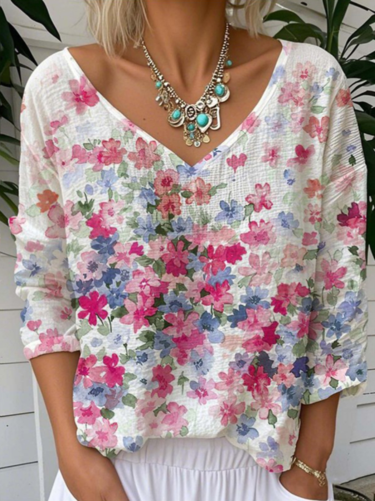 Floral Print V-neck Linen Blend Casual T-shirt