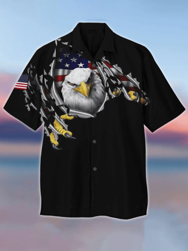 Men's Casual Eagle American Flag Print Button Up Shirt