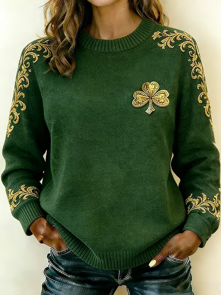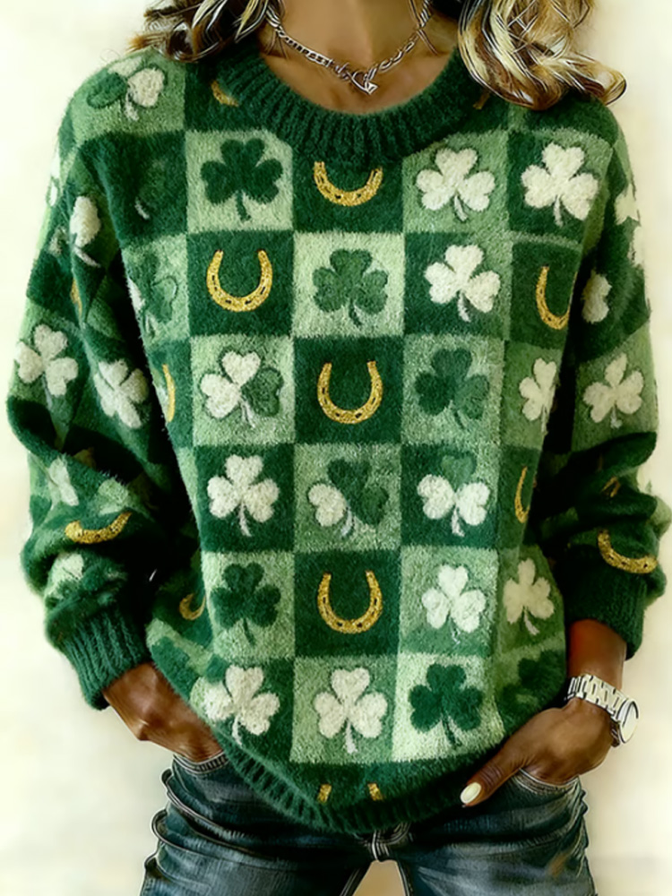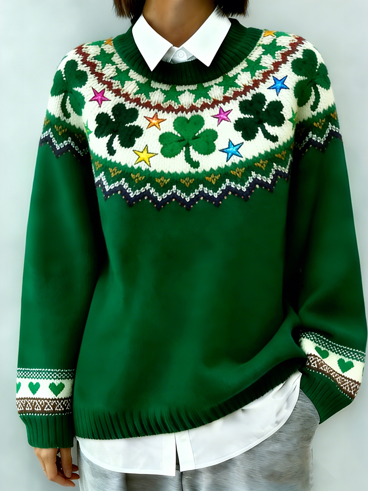 Women's St. Patrick's Day Retro Clover Knit Print Crew Neck Sweater