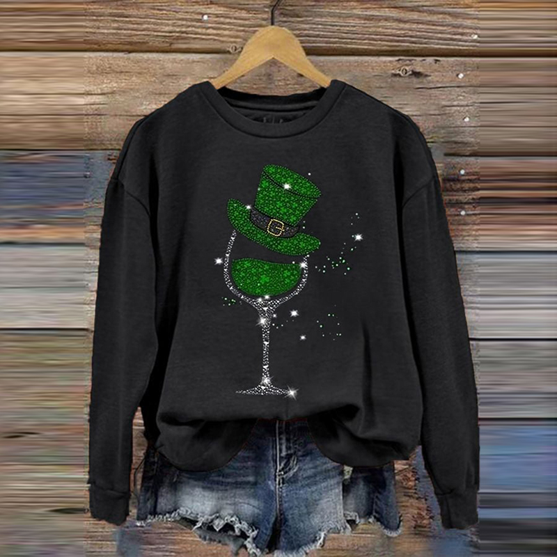 St. Patrick's Day Cree Shamrock Wine Glass Print Casual Sweatshirt