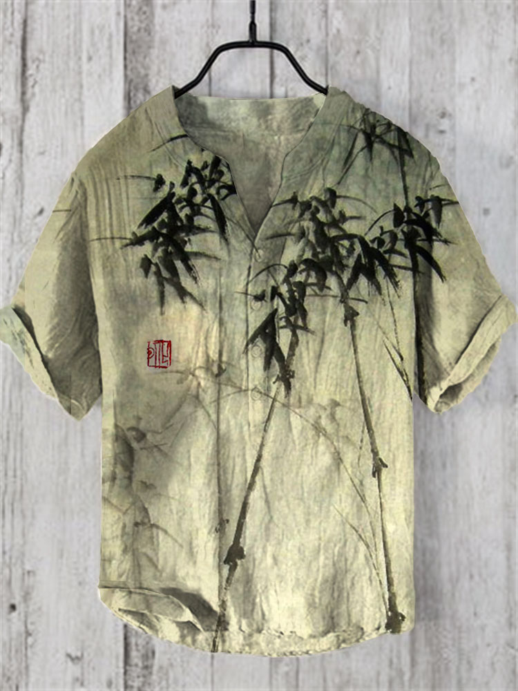 Men's Vintage Japanese Art Bamboo V Neck Casual Linen Blend Shirt