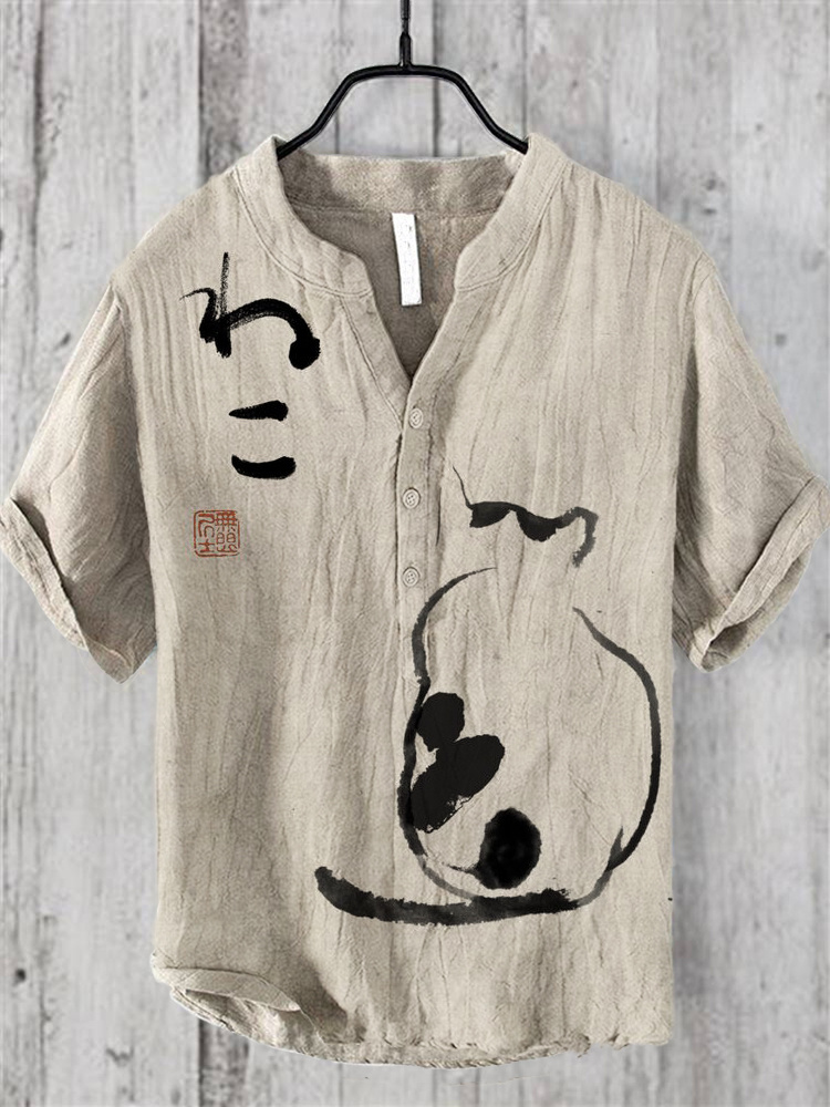 Men's Vintage Japanese Art V Neck Casual Linen Blend Shirt