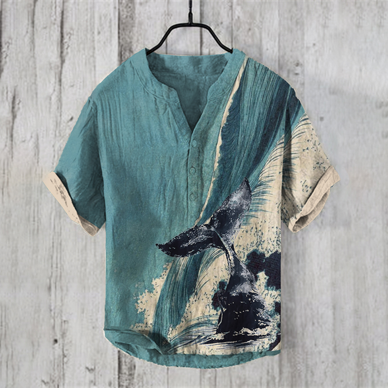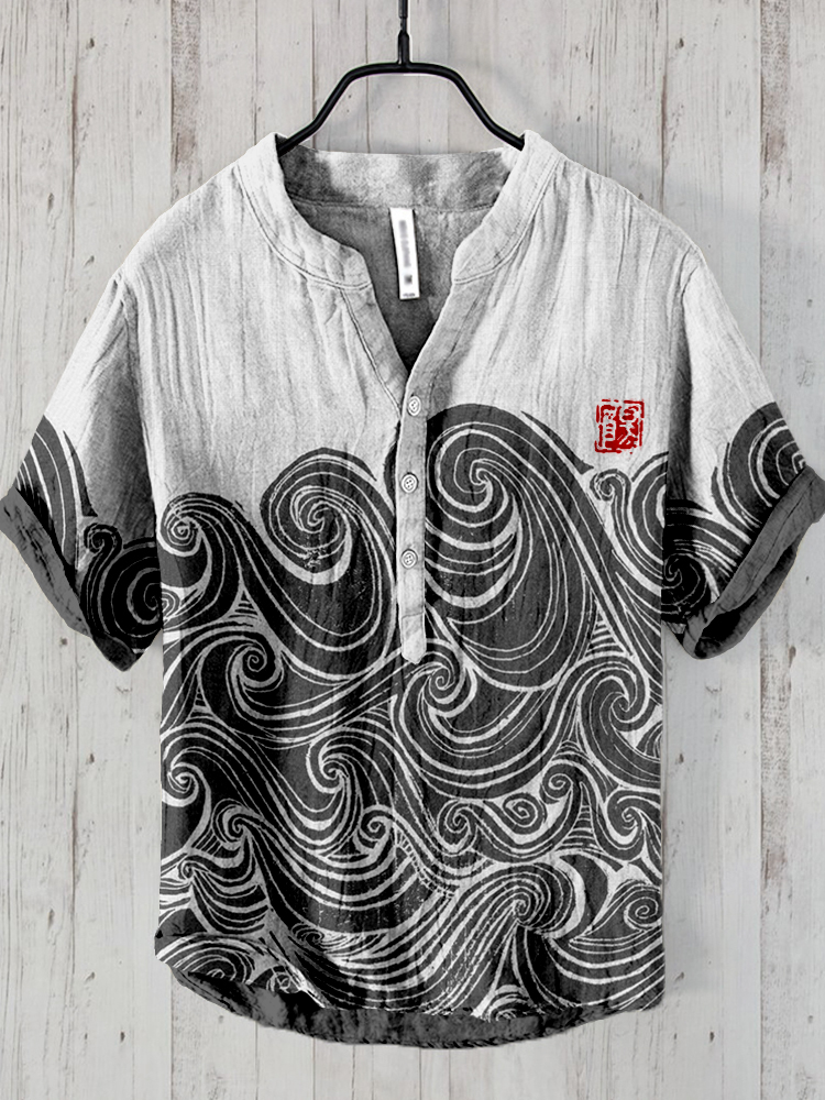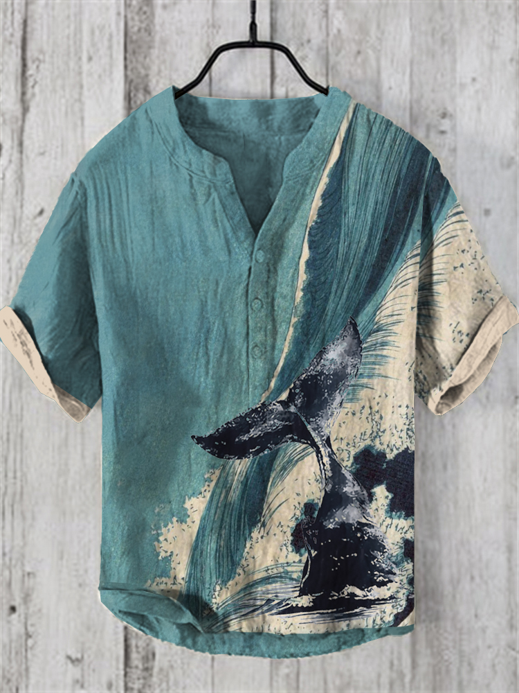 Men's Retro Whale Waves Japanese Art Linen Henry Collar Shirt