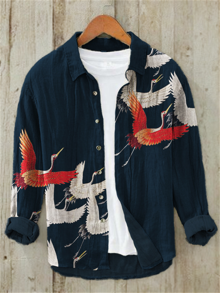 Flying Cranes Japanese Art Linen Blend Shirt