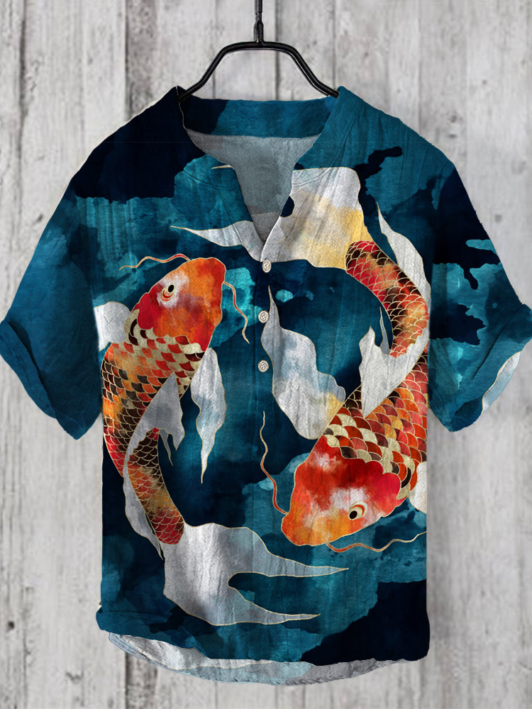 Men's Vintage Japanese Art Goldfish Casual Linen Blend Shirt
