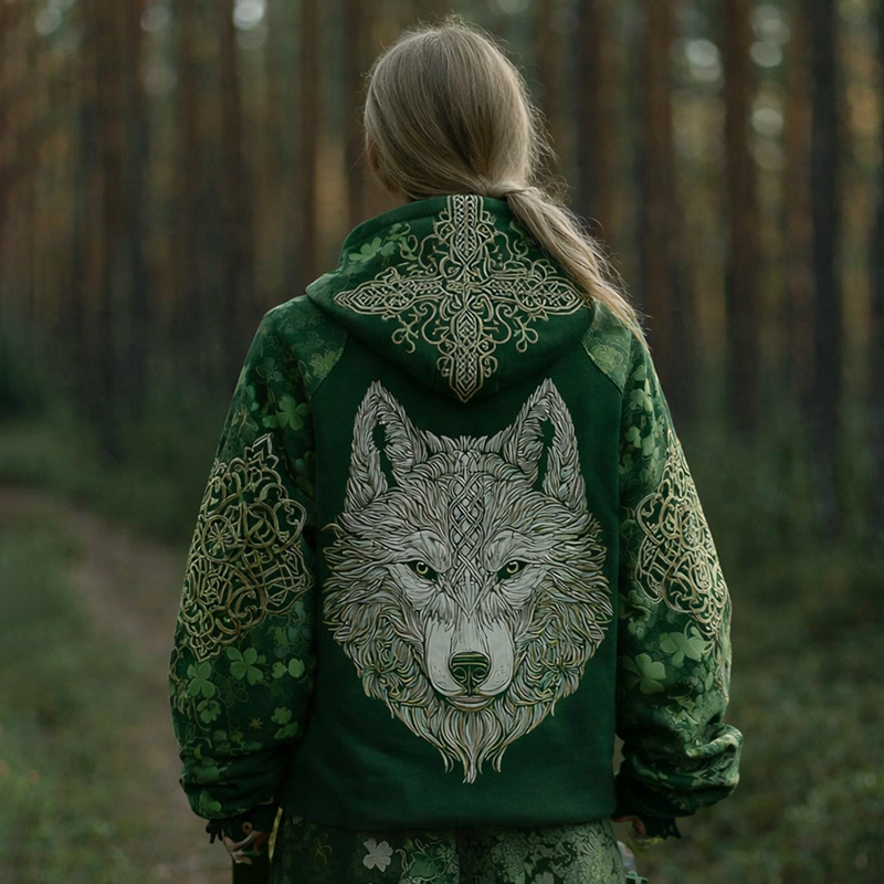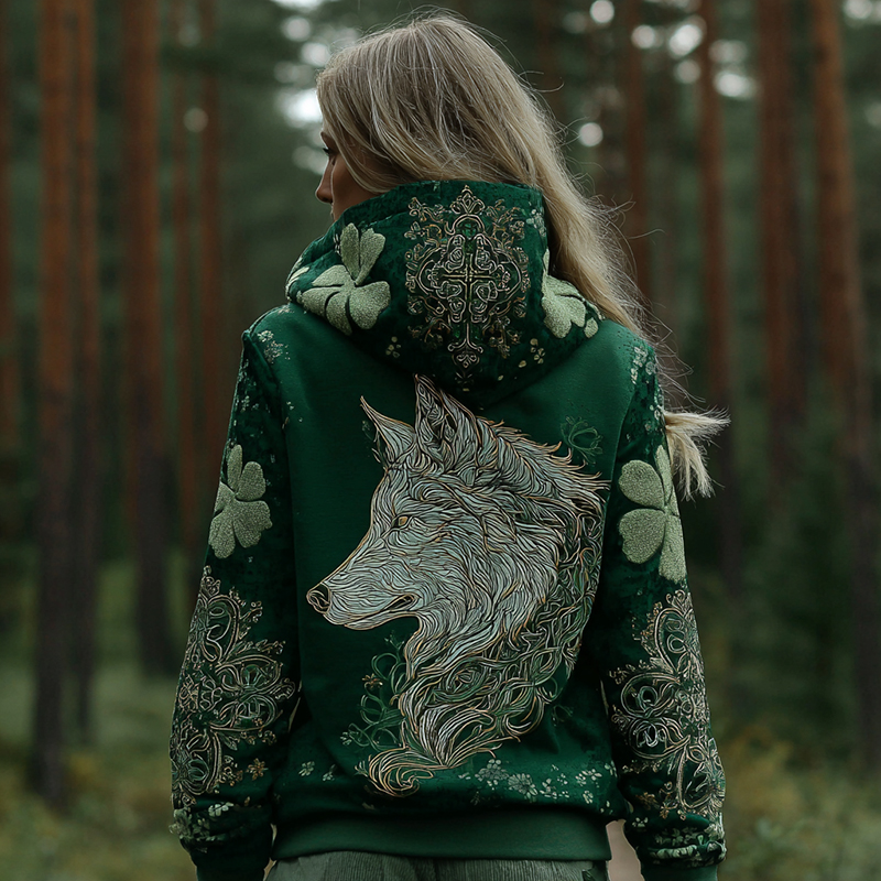 Women's Irish Viking Wolf Shamrock Print Casual Hoodie