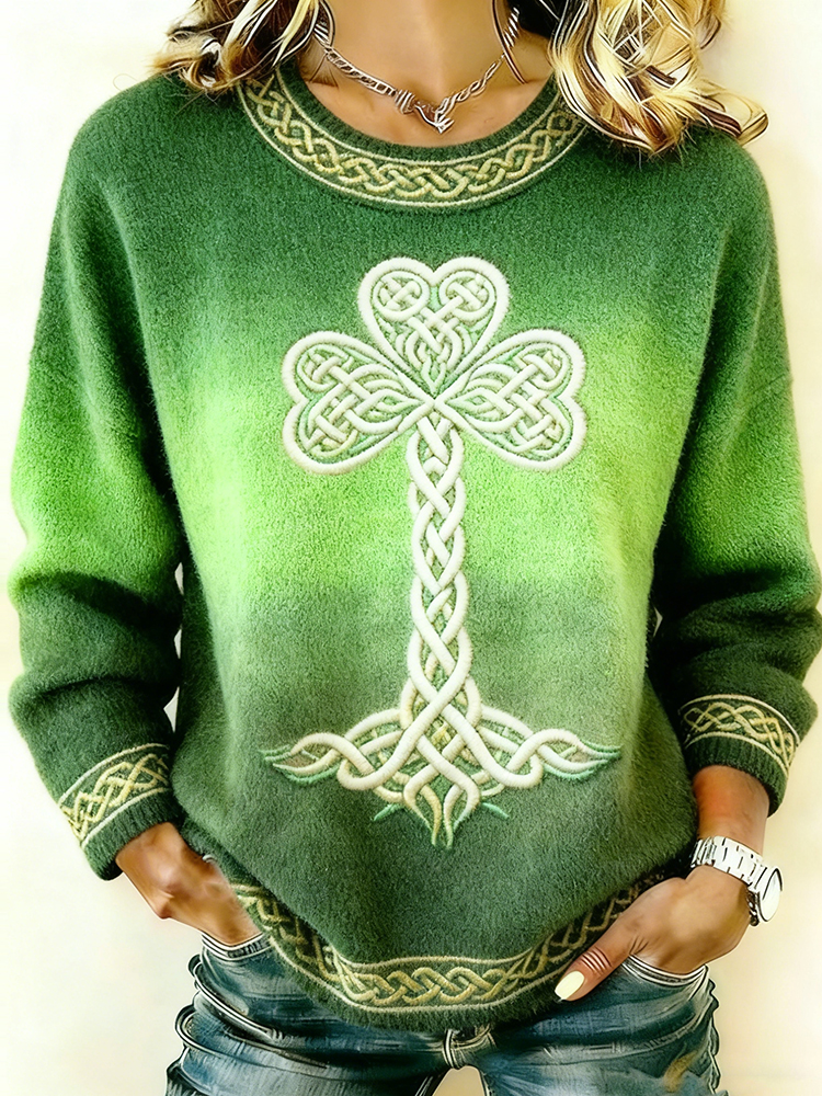 Vintage St. Patrick's Day Celtic Knot Lucky Four-leaf Clover Art Lines Knit Hoodie Sweater