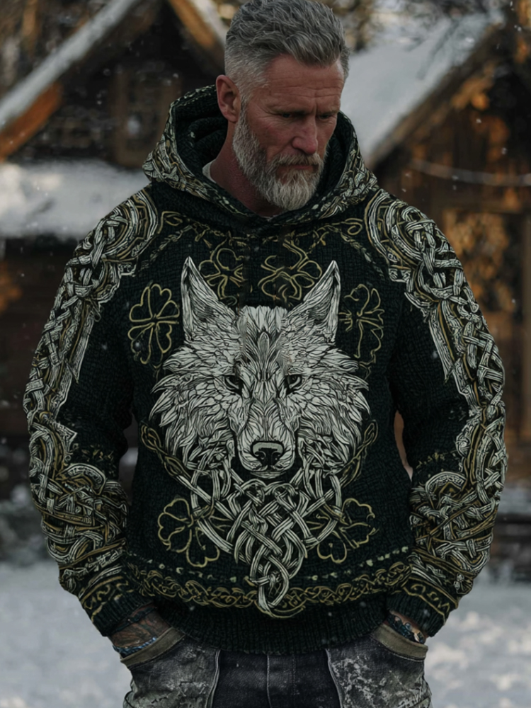 Men's St. Patrick's Day Celtic Knot Wolf Totem Four-leaf Clover Art Lines Sweater