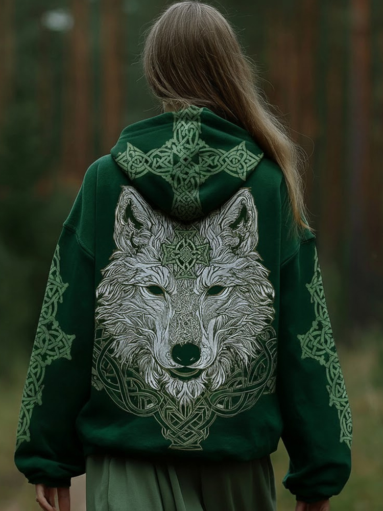 Women's Vintage Irish Viking Wolf Print Casual Hoodie