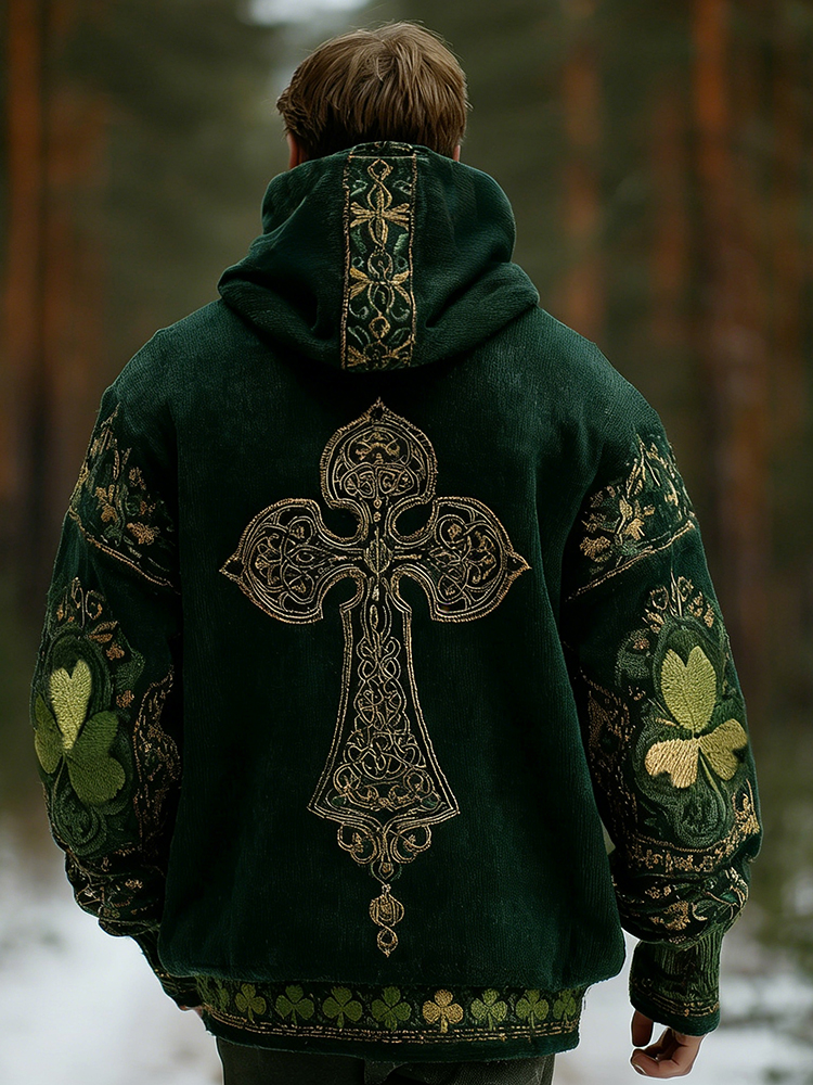 Men's St Patrick's Day Celtic Cross With Shamrock Print Knit Zipper Hoodie