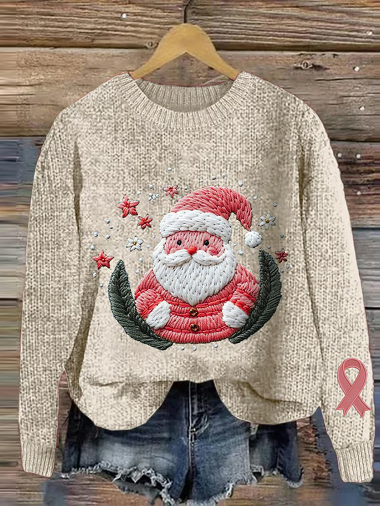 Christmas Santa Claus Pink Ribbon Embroidery Jacquard Knitting Cozy Knit Sweater