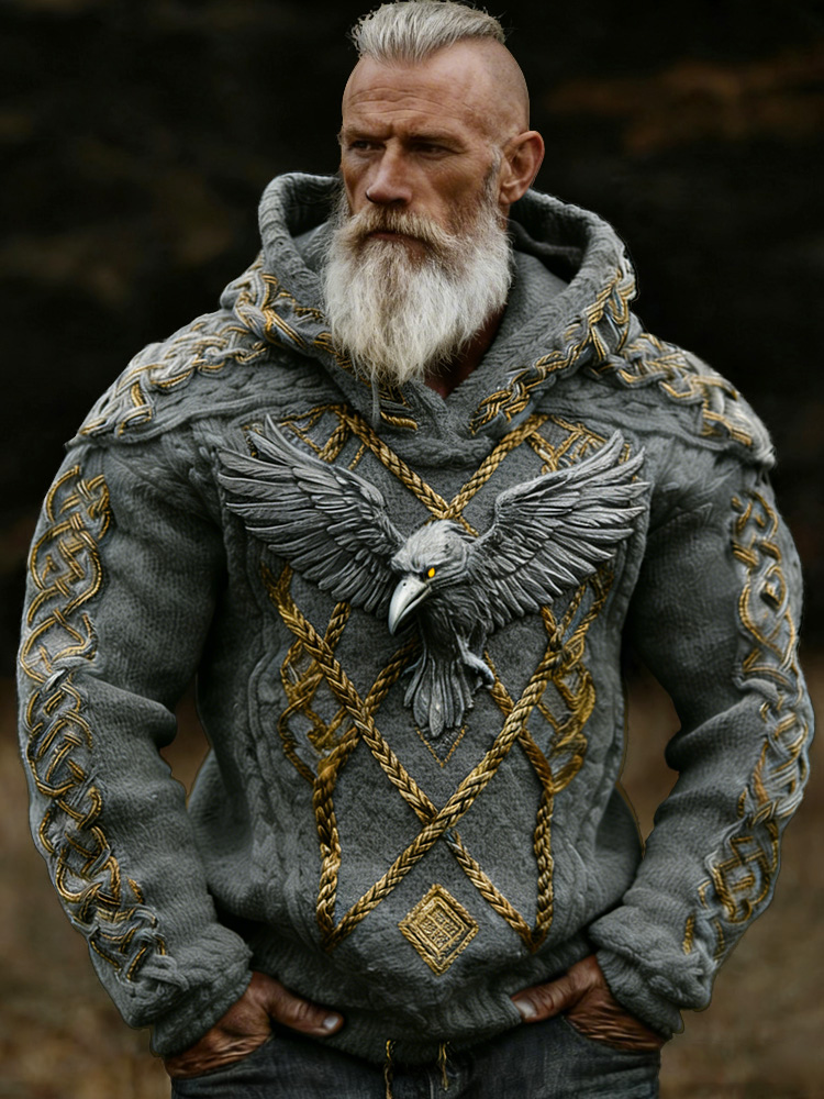 Men's Viking Crow Celtic Knot Jacquard Knitted Hooded Sweater