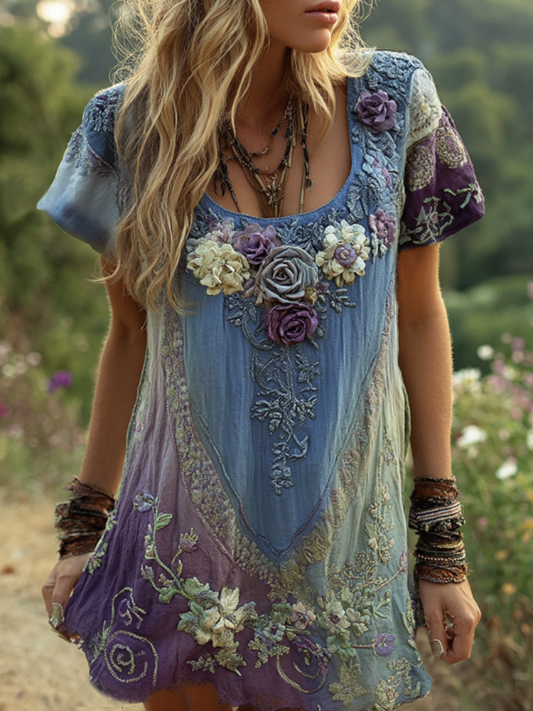Vintage Purple And Blue Lavender Patchwork And Floral Embroidered Art Linen Round Neck Maxi Dress