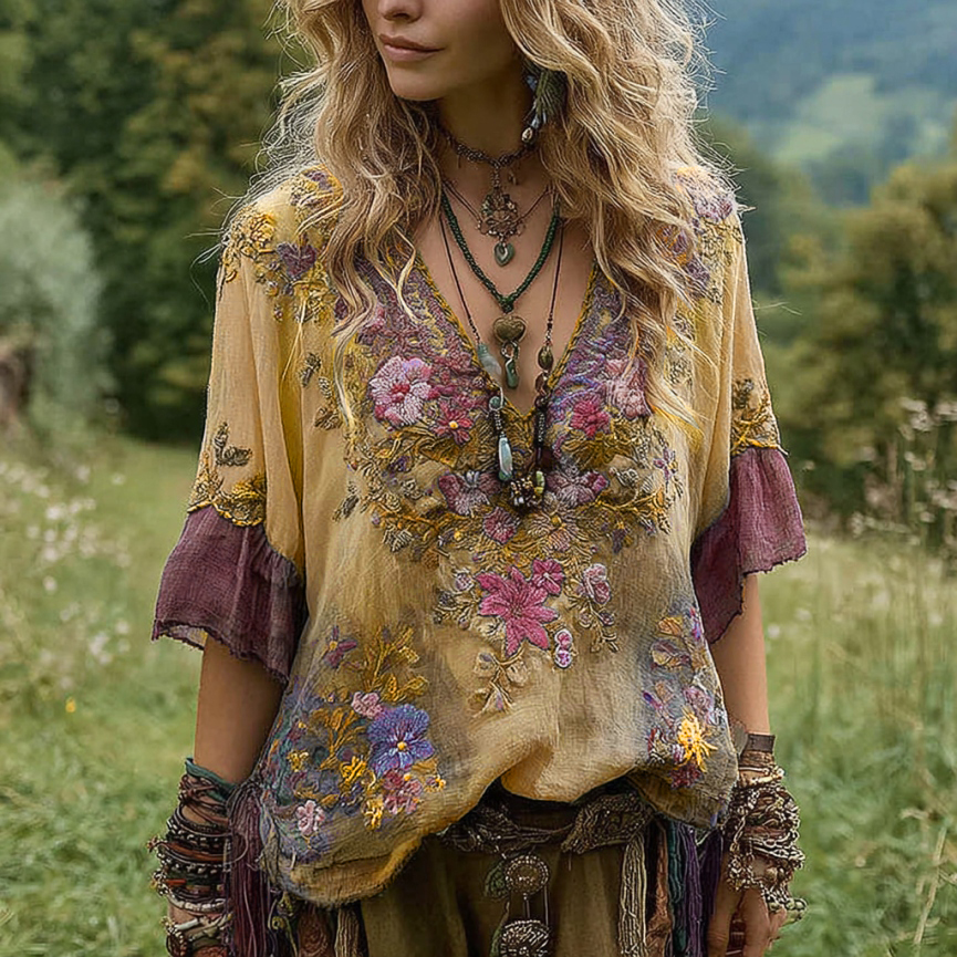 Women's Vintage Floral Embroidery Art V Neck Linen T-shirt