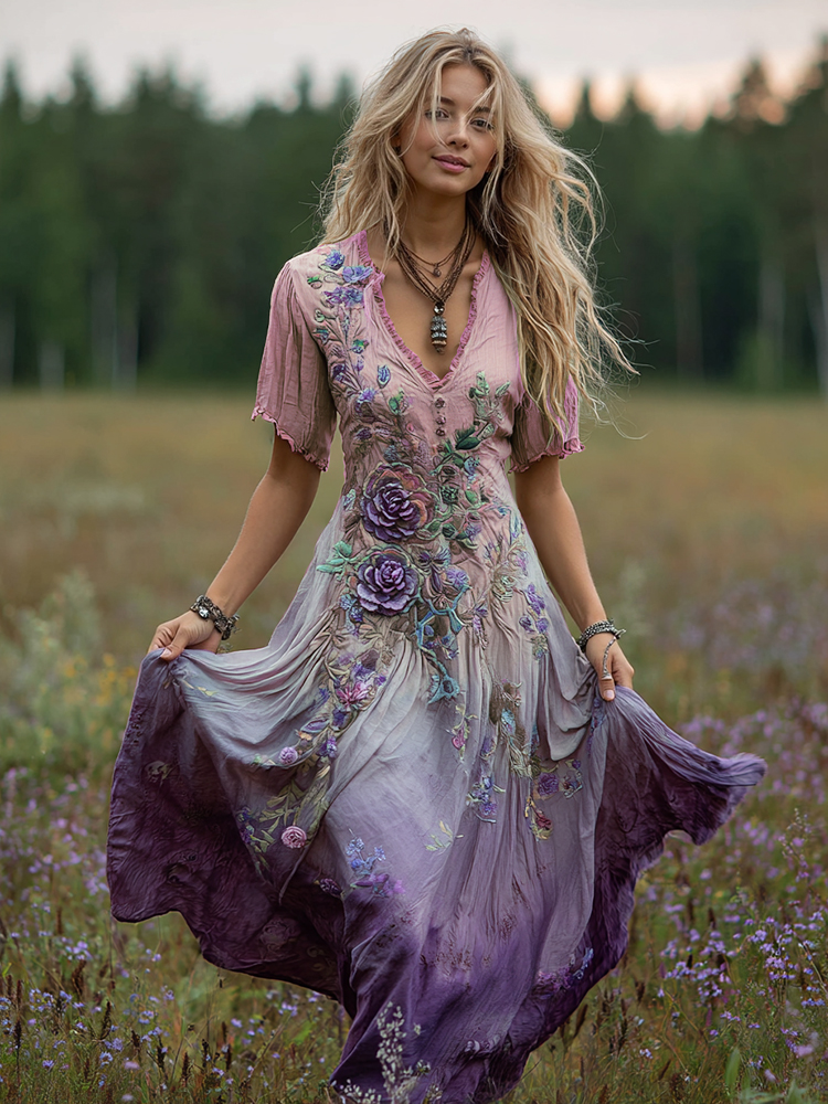 Vintage Classy Gradient Blue And Purple Lavender And Floral Embroidered Linen Maxi Dress